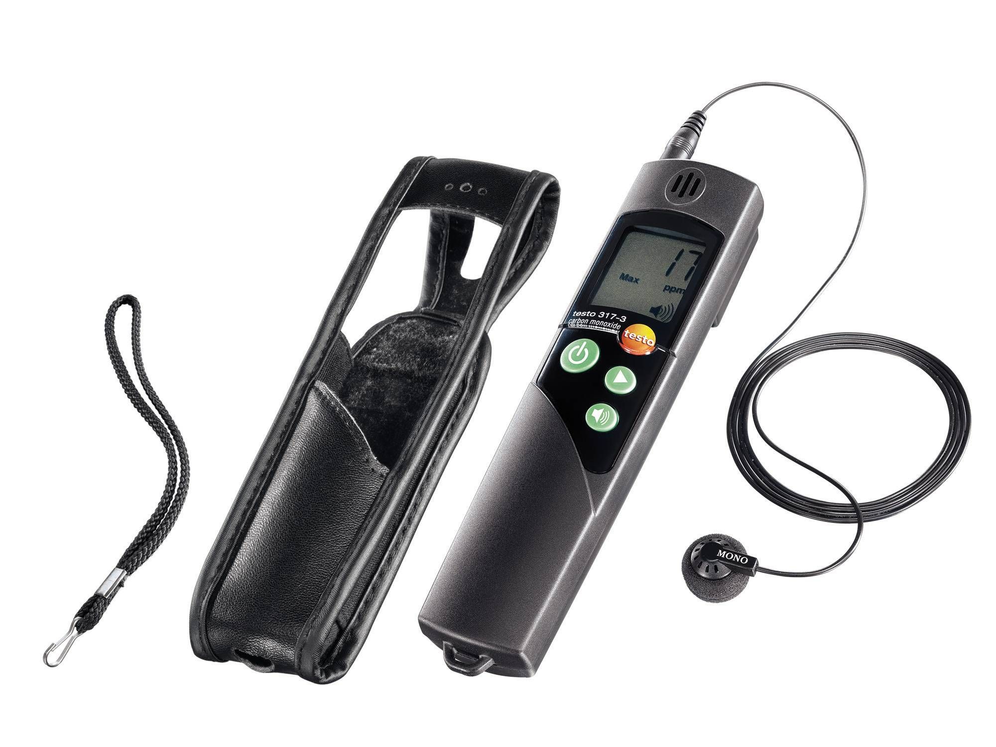 CO-Messgerät testo 317-3 für CO-Umgebungsmessung inklusive Tragetasche mit Gürtelclip, Kopfhörer, Handschlaufe und Kalibrier-Protokoll.